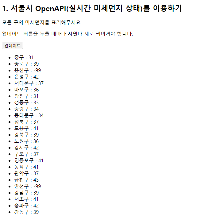 문제를 보시면 업데이트를 누를 때 마다 구와 미세먼지를 표기가 나오도록 해야하는데요.