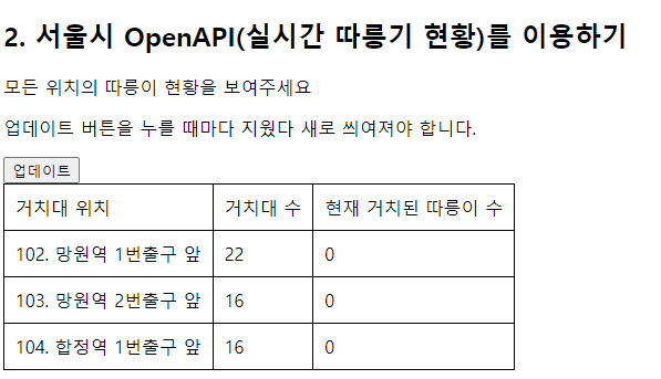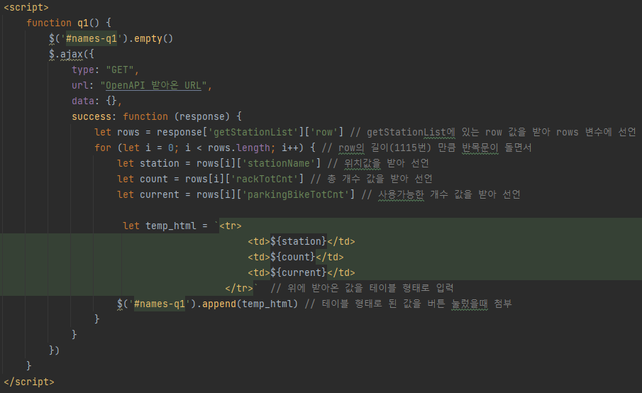 값들이 getStationList에 row에 존재 했으므로 그 값을 받아온 후, 위치, 총 개수, 현재 사용한 개수의 값들을 변수로 선언해서 위의 그림이 테이블 형태이브로 <tr></tr> 로 해서 값을 넣고 버튼을 눌렀을때 값들이 첨부되어 업데이트 되도록 합니다.
