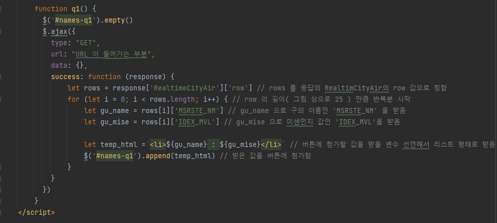 Ajax 자체의 틀은 똑같고 이제 success안의 값을 어떤 값을 넣는지를 보면, 아까 RealtimeCityAir 안에 있는 row 값들을 가져오기로 했기때문에 그 값을 가져오고 그림 상에서 25개의 ArrayList라 적혀있었기때문에 row의 길이 즉, row.length 만큼 돌면서 필요한 구와 미세먼지 값을 받고 버튼을 눌렀을때, 출력 되도록 코드를 넣었습니다. 결과 사진을 보여드리면