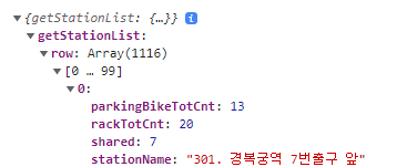 똑같은 방법으로 확인을 해보자면 getStationList 안에 있는 row값이 있고 거치대 위치, 거치대 수, 현재 거치된 따릉이 수를 받아와야하기 때문에 stationName, rackTotCnt, parkingBikeTotCnt 를 가져오면 되겠습니다.