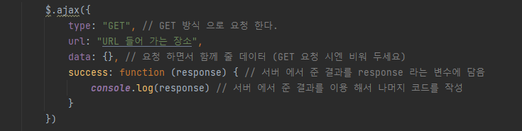 url은 요청할 url , data는 요청하면서 함께 줄 데이터 인데 단순히 데이터를 받아오는 경우에는 줄 내용이 없으니 비워두시면 됩니다. 성공적으로 받아오는 경우에 대해서 success에 어떤 방식으로 결과를 나타낼지 코드를 작성해 주면 됩니다.
