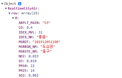 RealtimeCityAir 안에 row라는 Array가 존재하고 그 Array안에 값들이 나열되어 있는 모습을 볼 수 있습니다.