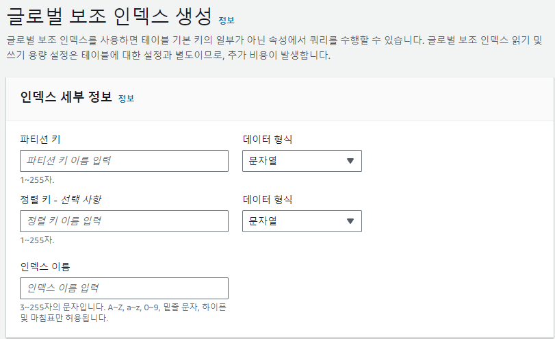 5. 인덱스 이름은 나중에 검색할때 필요한 값이므로 파티션 키랑 같은 값으로 하거나 구분 가능한 이름으로 설정