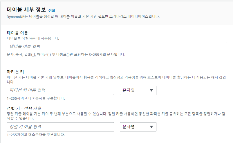 1. AWS -> Dynamo DB 검색 -> 왼쪽 목록에서 테이블 선택 후 테이블 생성