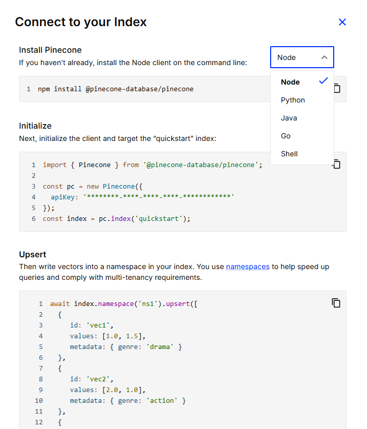 @pincone-database/pinecone 라이브러리를 찾아가서 내용을 확인 하셔야합니다. (다른, 언어도 마찬가지 일거라 생각됩니다.)