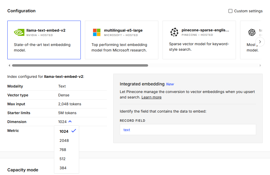 Pinecone에 데이터를 저장하기 위해서는 차원을 골라야하는데요.