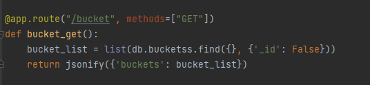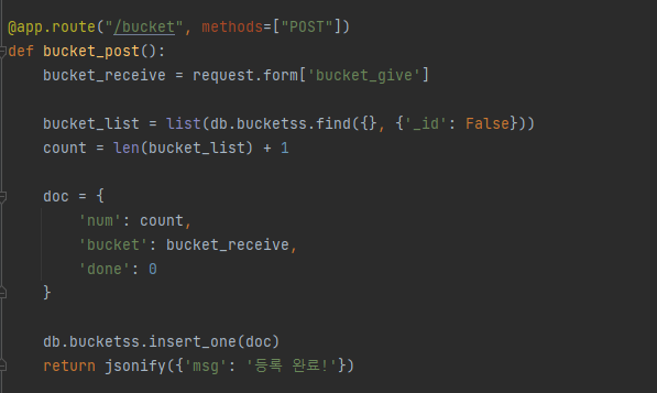 그림과 같이 입력을 받으면 Ajax 코드에서 그 값을 받아와 API의 _give() 쪽으로 넘겨주게 됩니다. 그럼 API는 bucket_give로 하여 받아와 변수에 입력하게 됩니다. 이때, 저희가 확인해야하는 부분은 버킷리스트를 기록할때의 순서와 다해서 지울때 입니다.