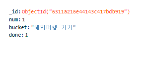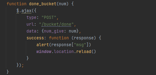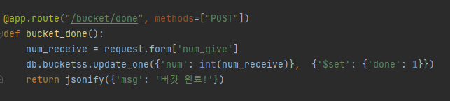 저 완료 버튼을 눌렀을때 버킷리스트가 끝나도록 하겠습니다. 먼저 버튼이 눌리면 done_bucket()이라는 함수가 적용됩니다. 그럼 그 숫자를 API에게 보내주게되고, API 코드는 그 숫자를 받아서 done값을 변경하게 됩니다. 0 -> 1로 말이죠. 근데 조심해야하는 부분은