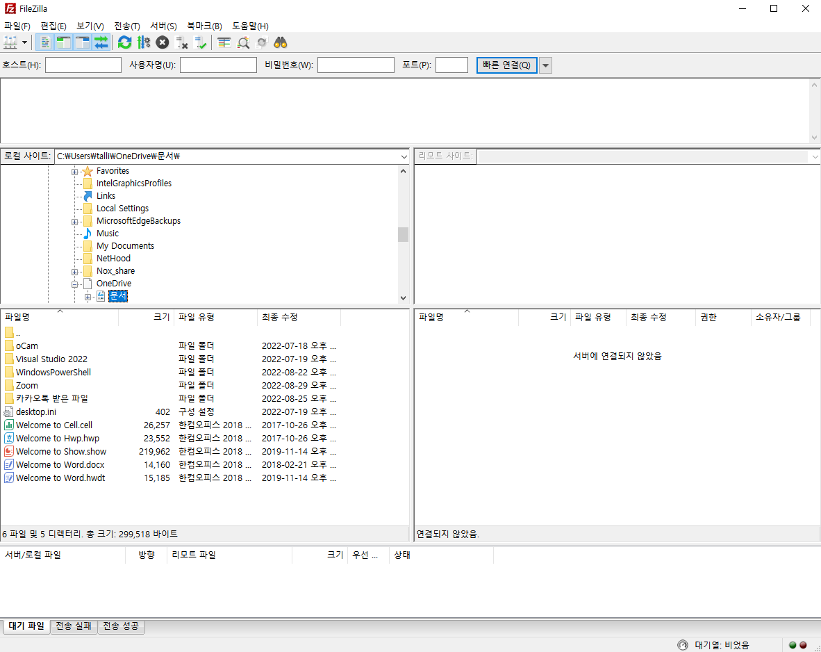 위에서 받은 파일질라는 쉽게 말씀드리면 파일을 옮겨주는 프로그램입니다. 좌측에 보이는 부분이 제 파일이고 우측은 연결한 서버의 프로그램이 됩니다.