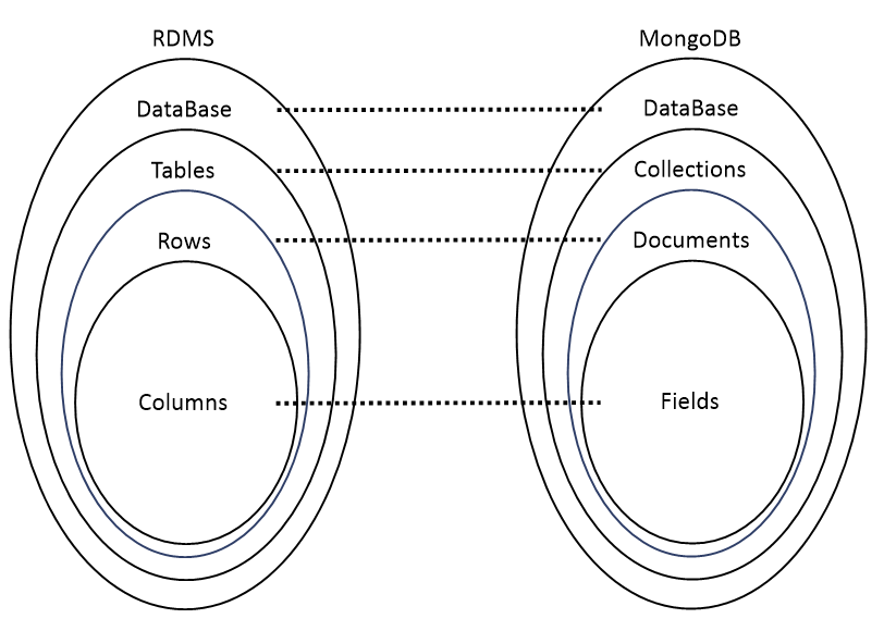 RDMS 와 MongoDB 의 데이터 계층 구조를 살펴보면 다음과 같습니다.
