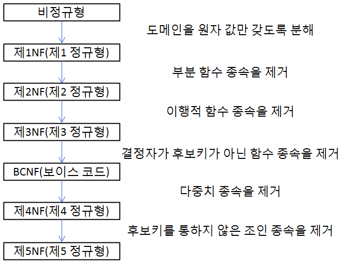 - 기본 정규형에 1NF, 2NF, 3NF, BCNF가 있고 고급 정규형에는 4NF, 5NF 존재