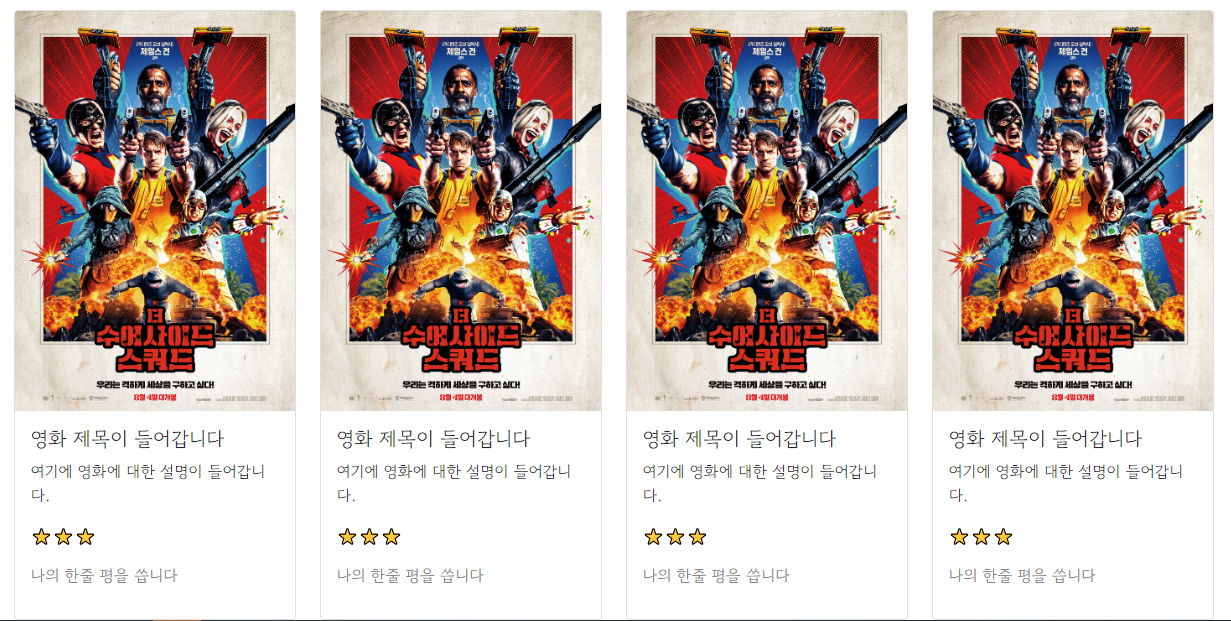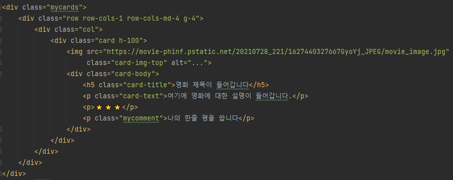 중요한 부분을 나눠서 보면 영화 제목, 설명, 별점, 코멘트가 들어갈 수 있는 card-body가 있고 그 위에 포스터 사진이 들어갈 수 있는 card h-100이 존재합니다.