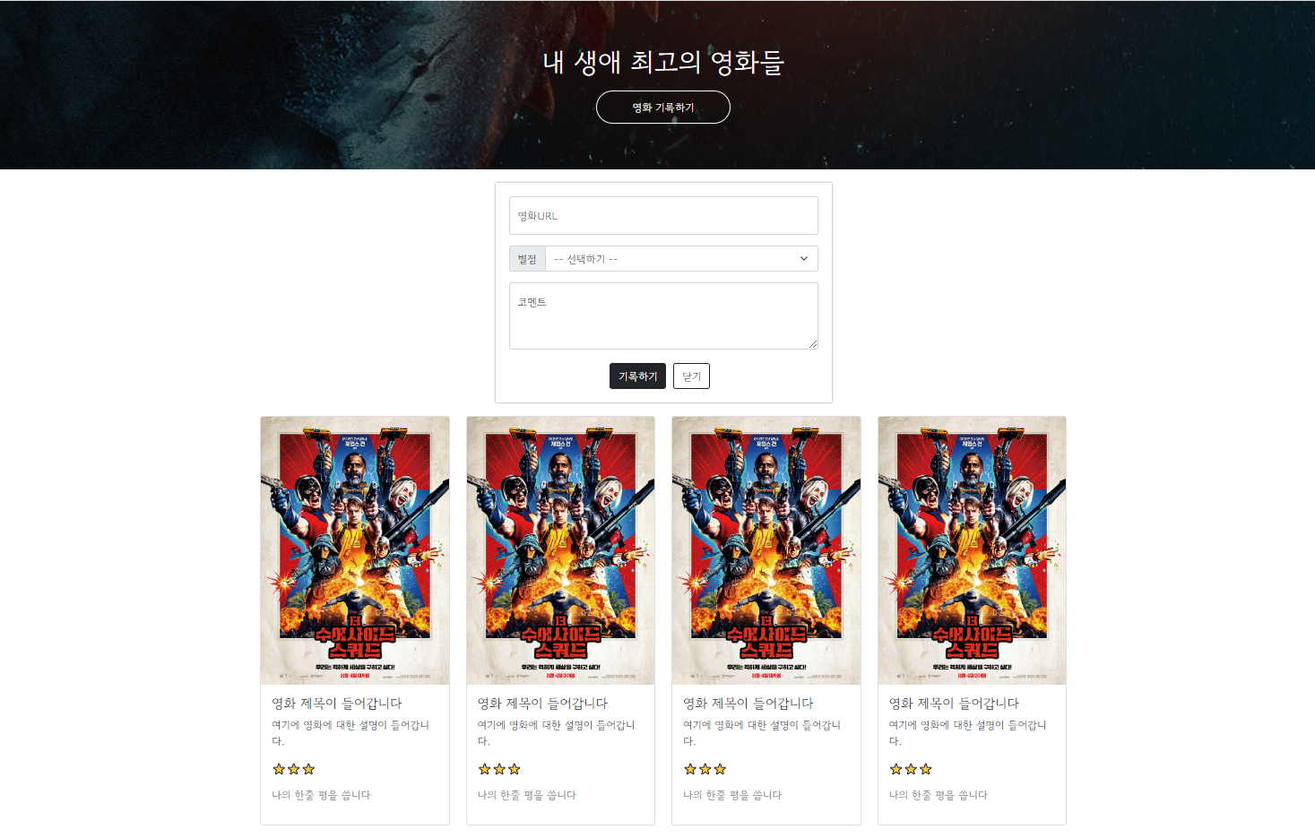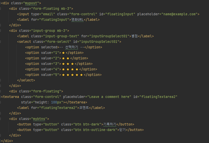 영화 기록하기라는 버튼이 존재했죠. 이 버튼을 눌렀을때 영화 포스터를 넣기 위한 URL, 별점 선택, 코멘트, 기록하기와 닫기 버튼이 나오도록 만들려고합니다.