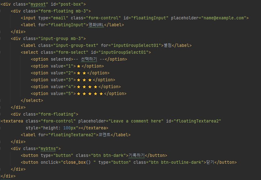 추가로 함수를 미리 넣어둘 예정인데요. 저희가 필요한 버튼은 제목 밑에있는 "영화 기록하기" 버튼과 "닫기" 버튼이므로
