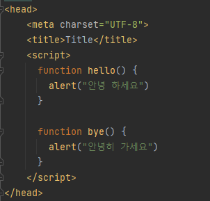 그 안에 아주 간단한 함수를 만들었는데요. hello()라는 함수와 bye()라는 함수입니다. 함수를 적으실때는 앞에 function을 꼭 적어주셔야합니다. 안에 내용물을 보시면 안녕 하세요, 안녕히 가세요 앞에 alert라고 나와있는데요. 이건 어떤 것을 의미하냐면 함수가 발생했을때 다음과 같이 뜨도록 하는 코드입니다.