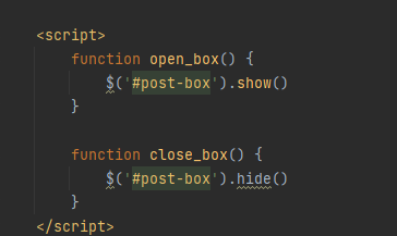 이제 함수를 만들면 위에 언급했듯이 1. 보이는 건 show 2. 닫는건 hide 이므로 각 함수를 만들어 줍니다.