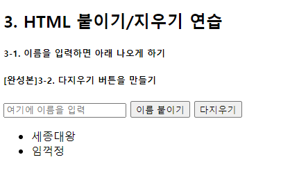 세번째 문제를 보시면 붙이고, 지우는 코드를 만들라고 하는데요. 먼저 버튼이 두개이니 함수도 2개가 필요해보입니다.