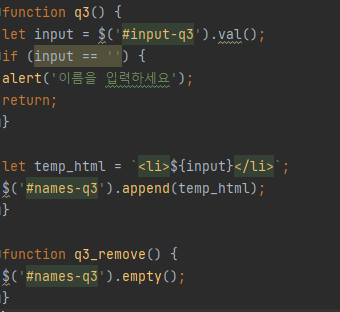 일단 문자가 안들어왔을 때를 대비해서 만들고 문자가 들어오게 되면 똑같이 받아서 값을 넣게 되는데 왜 <li></li>가 들어 갔나요? 라고 하실수 있습니다. 그건 세번째 문제를 보셨을때 점으로 하여 나열이 되었기 때문에 list모양의 <li></li>넣어 주게 된 것입니다. 그래서 함수 부분을 조금 더 설명 드리면